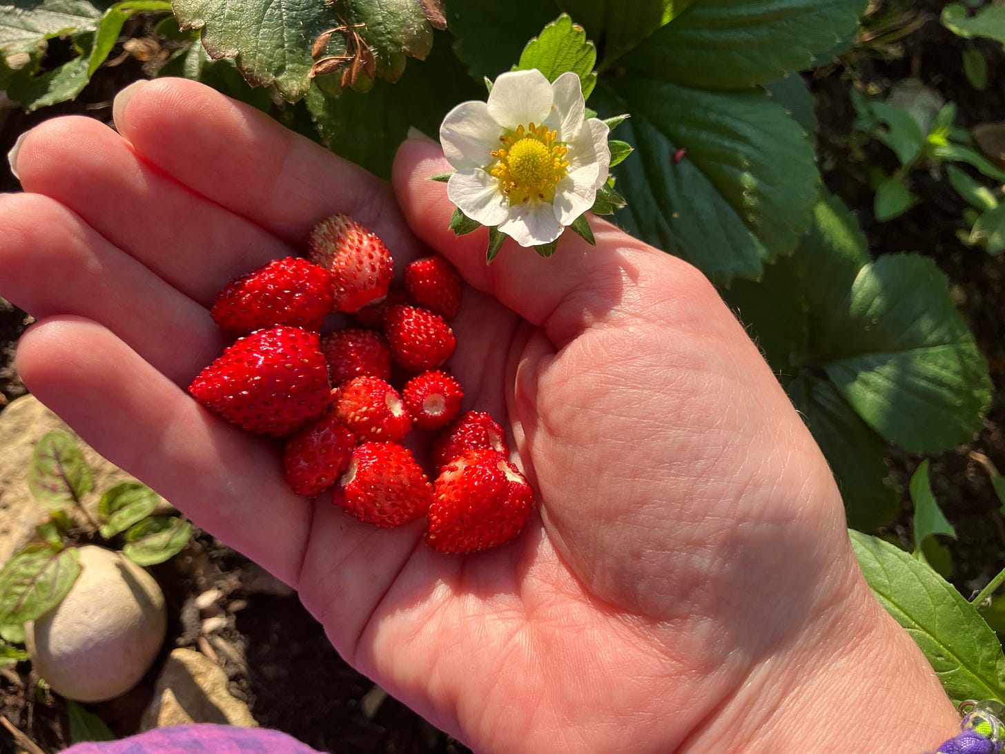 On August 1st, I drove straight past the allotment on my way home from work, so sure was I of rain. By the time I got home, I decided it was only a little drizzle and worried my poor squashes would not get enough water. They are so thirsty right now. I headed off on foot back to the allotment, getting soaked in a downpour, but appreciating the cooler damp air after a few days of intense heat. On reaching the plot I sheltered under my neighbour’s plum tree where it dawned on me, I have had this little patch of land less than a year. Last Lammas it was overgrown barren patch of land with brittle straw grass and thistle. This week we have been harvesting beans, courgette, peas, potatoes and beetroot. From the garden back here we are picking apples, plums and these most adorable tiny strawberries grown from seed last year. I call them fairy strawberries and leave one as an offering at the fairy door every time I harvest them. I have everything to be grateful for. Everything.
